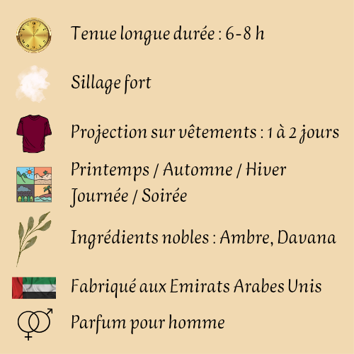 Parfait pour les soirées, les saisons fraîches et les occasions où l’on souhaite se démarquer, " Asad Bourbon " offre une excellente tenue et une présence affirmée qui ne passe pas inaperçue.