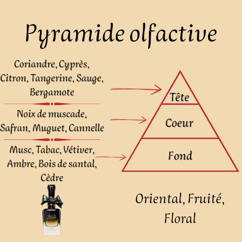 Dès les premières notes, des accords d'agrumes et d'épices s’épanouissent, apportant une sensation lumineuse et séduisante. Le cœur dévoile une composition harmonieuse mêlant fleurs élégantes et touches gourmandes, tandis que le fond ambré, musqué et légèrement boisé enveloppe la peau d’un sillage sensuel et durable.