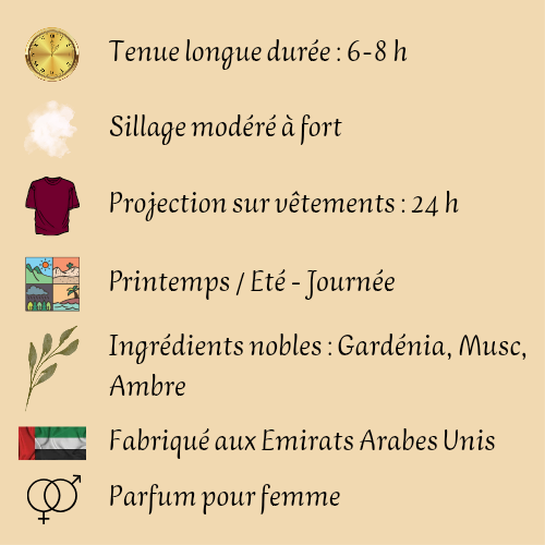 Pour une expérience sensorielle optimale, appliquez le parfum sur les points de pulsation tels que le cou, les poignets, la poitrine et derrière les oreilles, permettant ainsi une diffusion subtile et élégante tout au long de la journée.