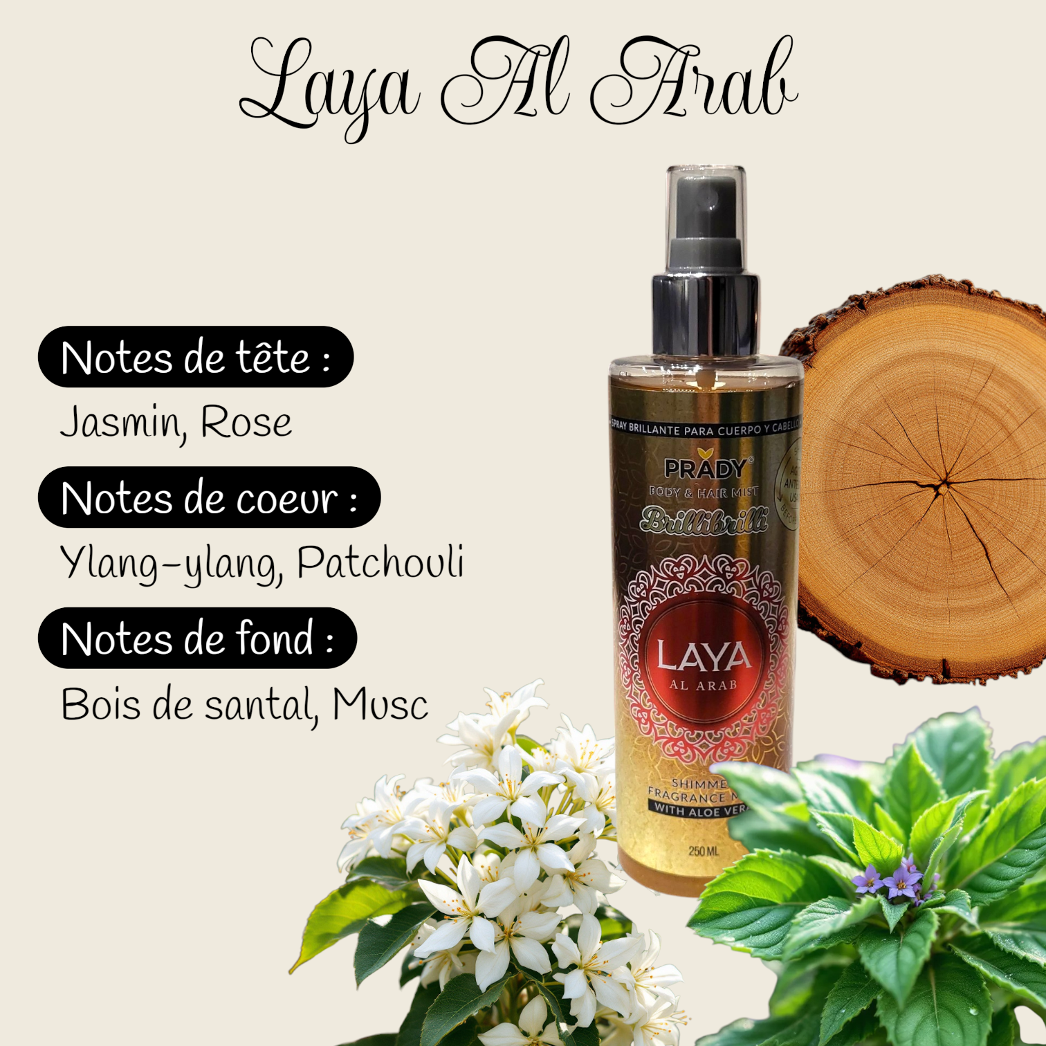Succumb to the mystical elegance of " Laya Al Arab ," a glittery body mist inspired by the sumptuous " Ameerat Al Arab " fragrance. Its captivating scent blends intense floral notes, woody touches, and refined oriental accords for a sensory experience worthy of a thousand and one nights.