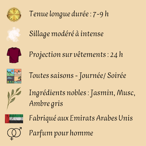 Pour une expérience sensorielle optimale, appliquez le parfum sur les points de pulsation tels que le cou, les poignets, la poitrine et derrière les oreilles, permettant ainsi une diffusion subtile et élégante tout au long de la journée.