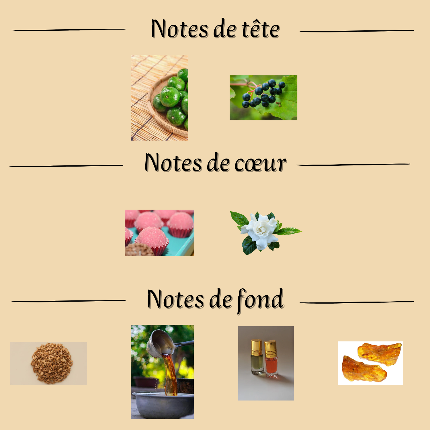 Notes de fond : Bois de santal, Sirop de vanille, Musc, Ambre / Vanille, Bois de santal, Musc