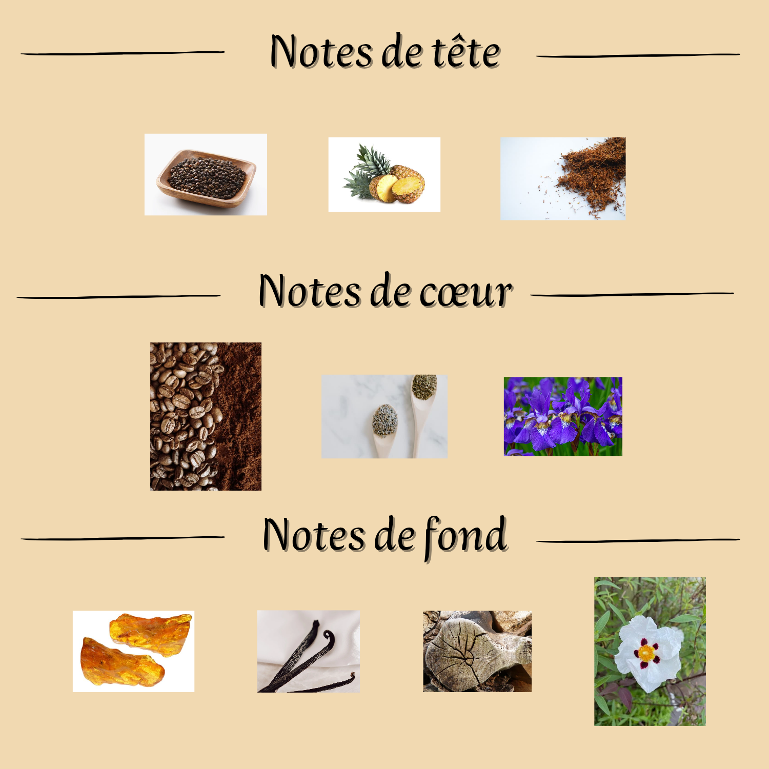 Notes de tête : Lavande, Poivre noir / Poivre noir, Ananas, Tabac