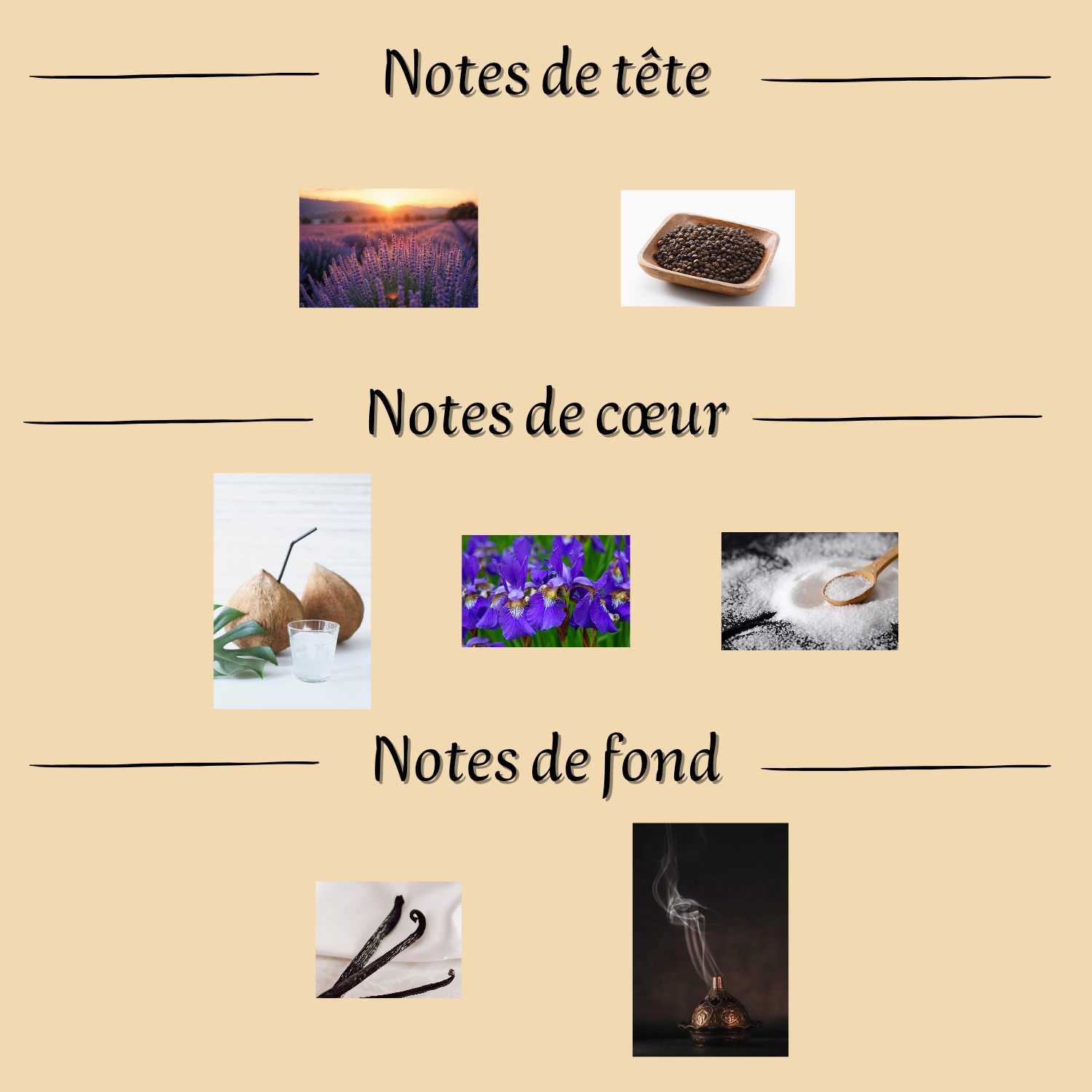 Notes de cœur : Eau de coco, Iris, Sel / Café, Patchouli, Iris