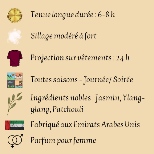 Pour une expérience sensorielle optimale, appliquez le parfum sur les points de pulsation tels que le cou, les poignets, la poitrine et derrière les oreilles, permettant ainsi une diffusion subtile et élégante tout au long de la journée.