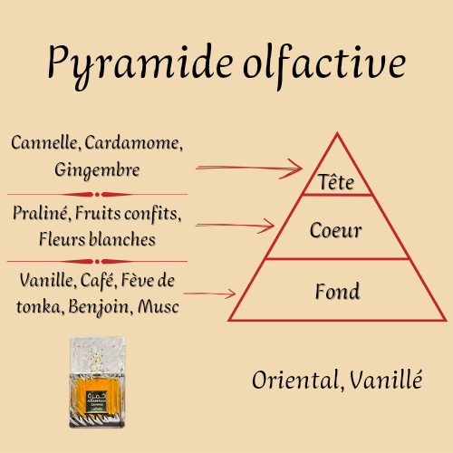 Dès les premières notes, le parfum dévoile un accord épicé de cannelle et de cardamome, relevé par une touche vibrante de gingembre. Le cœur révèle du praliné, mêlé à des nuances de fruits confits et de fleurs blanches. Enfin, le fond s’enveloppe d’une douceur réconfortante avec la vanille, le café arabica, la fève tonka, le benjoin et du musc qui prolonge le sillage de façon majestueuse.