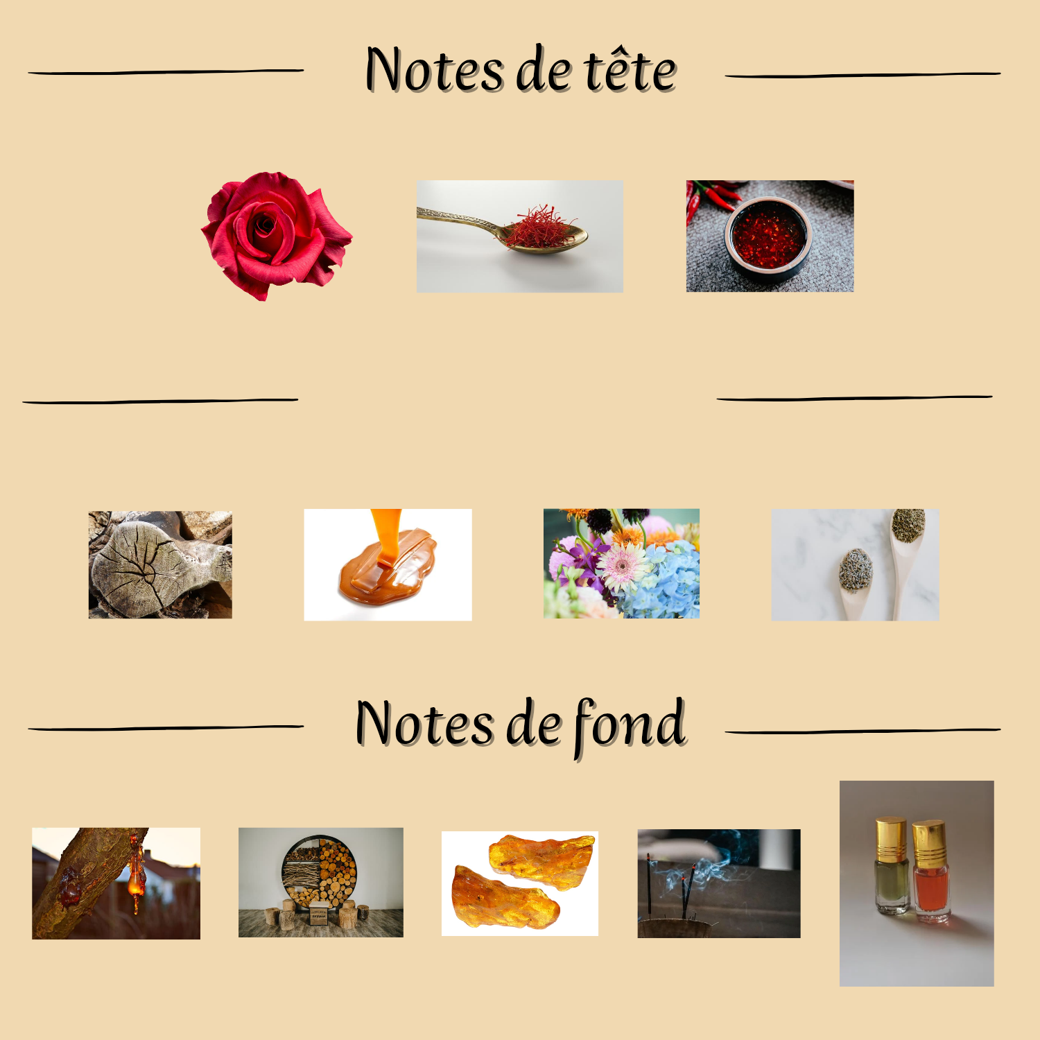 Cette fragrance s’ouvre sur des notes florales et épicées, avant de dévoiler un cœur sucré et chaleureux mêlant caramel, bois d'agar et accords orientaux. En fond, les notes boisées se déploient pleinement, sombres et magnétiques, apportant un sillage puissant et irrésistible.