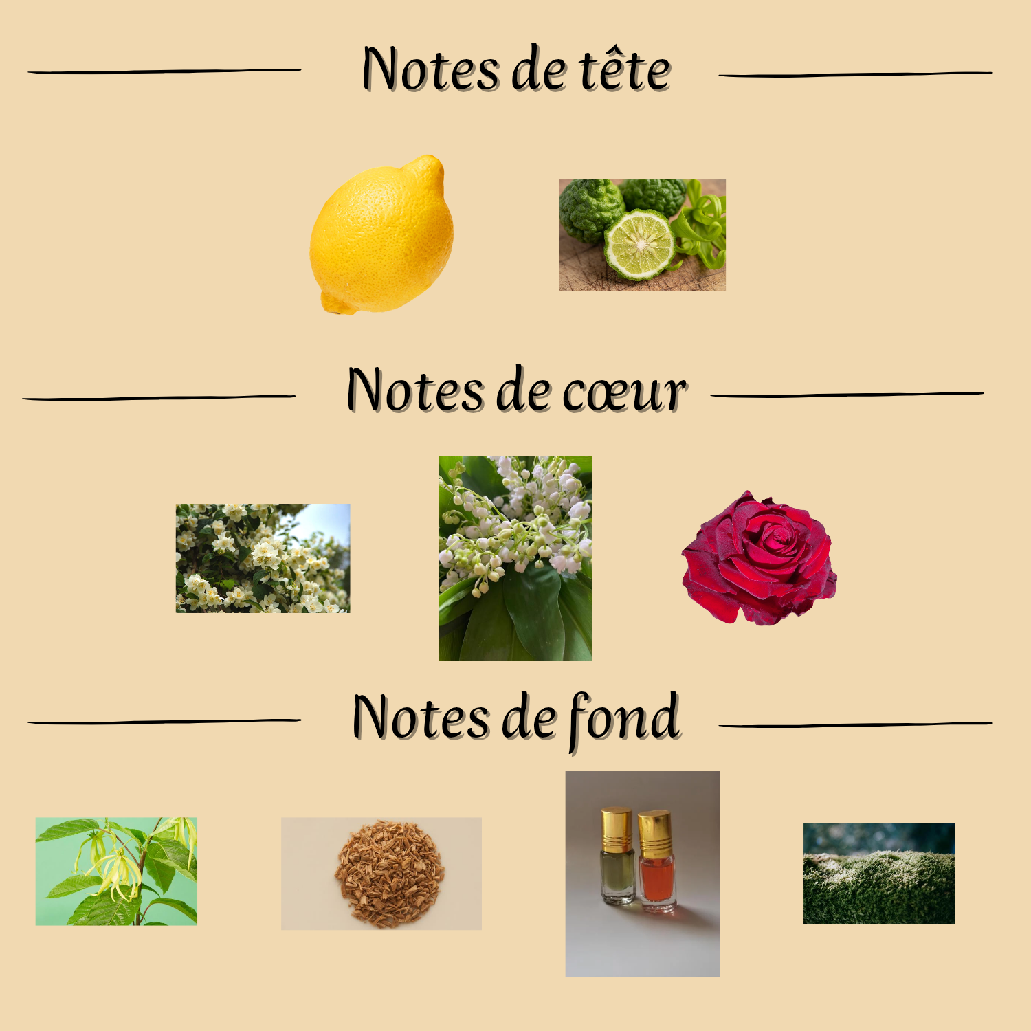 Notes de fond : Ylang-ylang, Bois de santal, Musc, Mousse