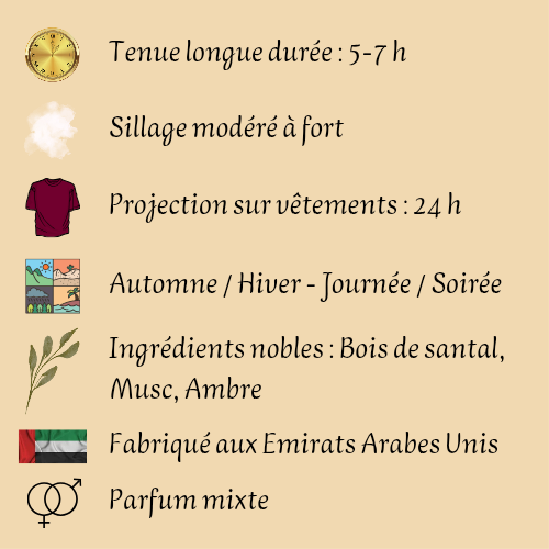 Notes de fond : Bois de santal, Musc, Ambre