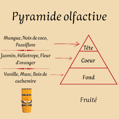 From the opening, the juicy and sparkling notes of mango and coconut bring an exotic and joyful touch. The floral heart, dominated by jasmine and orange blossom, evokes vacations, warmth, and sunshine. The base, soft and sensual, gives way to a creamy musk and a suave vanilla that prolongs the olfactory experience with subtlety and refinement.