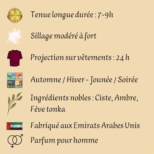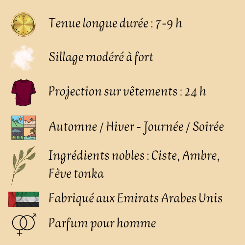 Riche et profond, " Khamrah Dukhan " incarne l’élégance des parfums orientaux modernes : un sillage ambré et épicé, à la fois noble, audacieux et irrésistible.