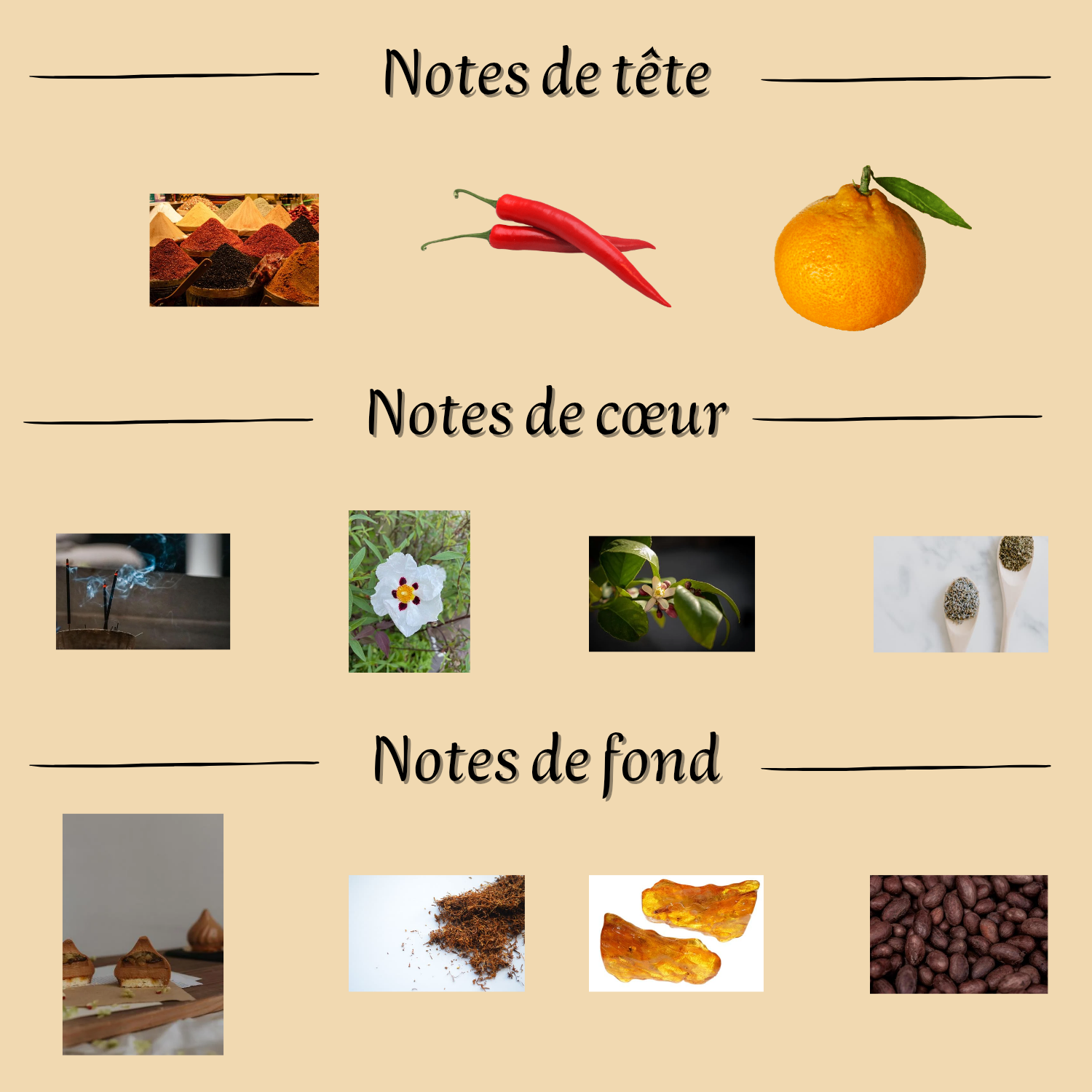 Notes de cœur : Encens, Ciste, Patchouli, Fleur d’oranger