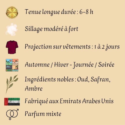 Notes de tête : Fumée de bois d’agar, Safran, Cannelle