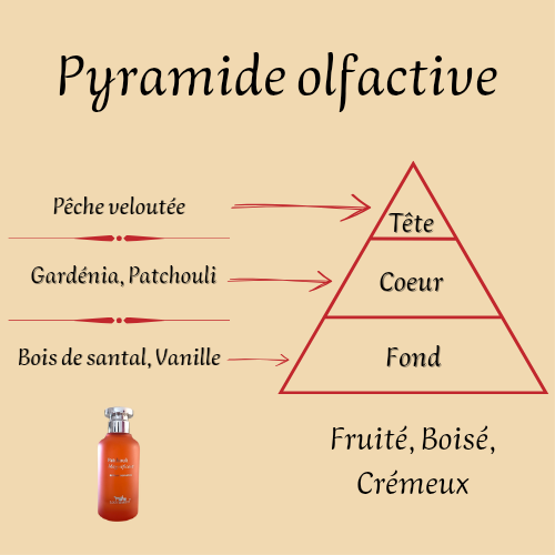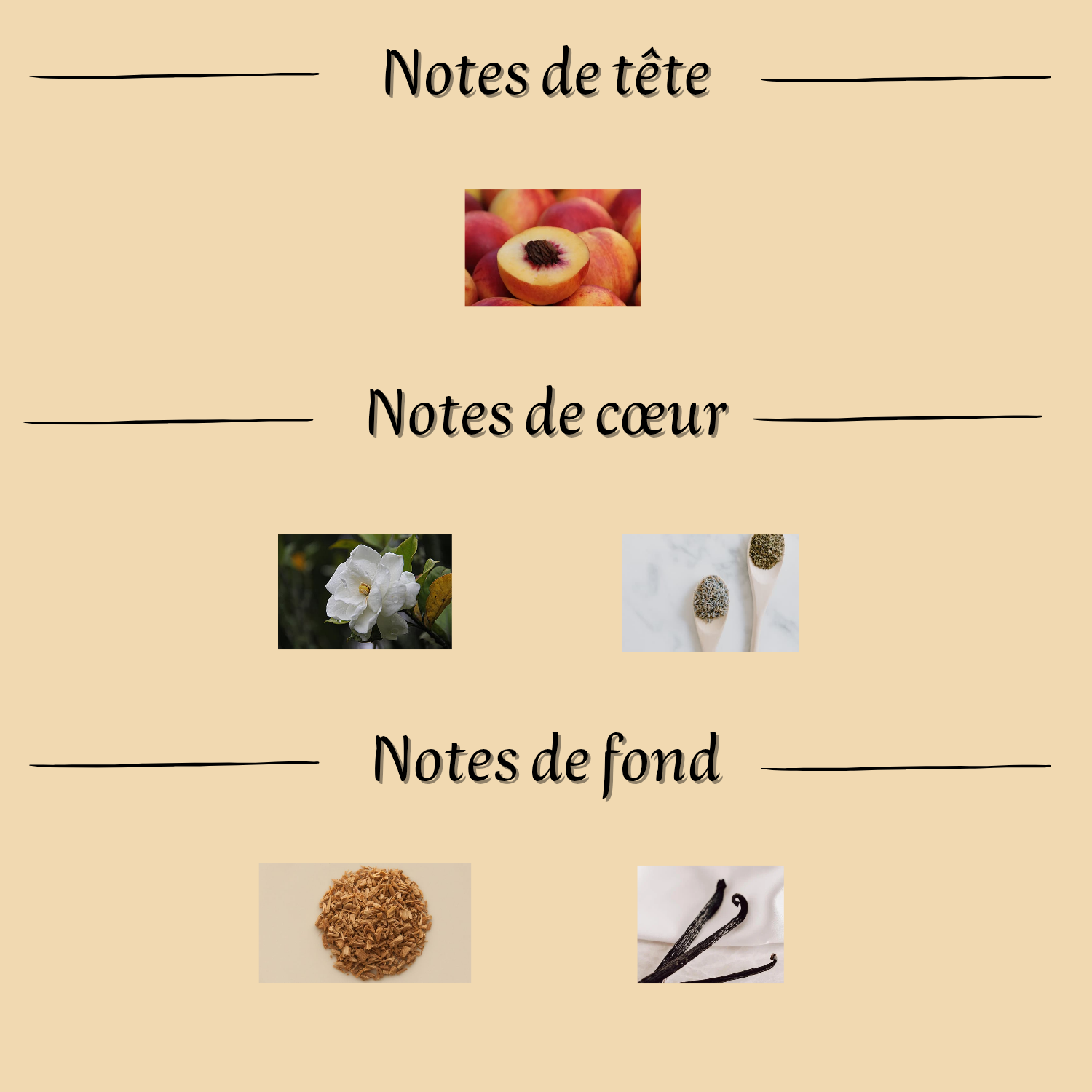 La profondeur du patchouli se marie à la vanille chaude, au santal crémeux et à une pêche veloutée créant un sillage magnétique et raffiné.