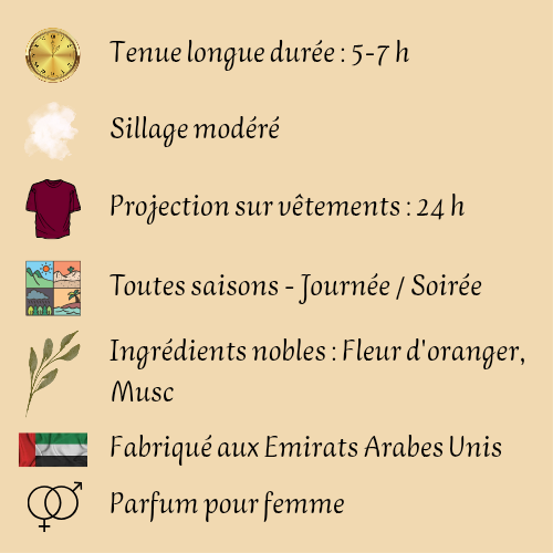 Pour une expérience sensorielle optimale, appliquez le parfum sur les points de pulsation tels que le cou, les poignets, la poitrine et derrière les oreilles, permettant ainsi une diffusion subtile et élégante tout au long de la journée.