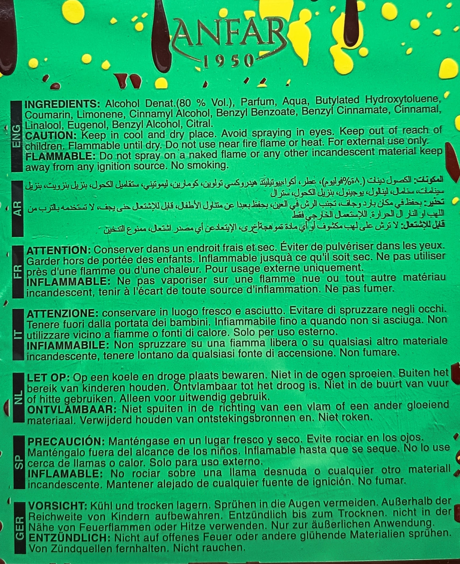 Alcohol Denat., Fragrance, Water, Linalool, Limonene, Butylphenyl Methylpropional, Hydroxyisohexyl 3-Cyclohexene, Carboxaldehyde, Geraniol, Citral, Citronellol, Eugenol, Coumarin, Benzyl Benzoate, Farnesol, Benzyl Salicylate, Benzyl Alcohol.