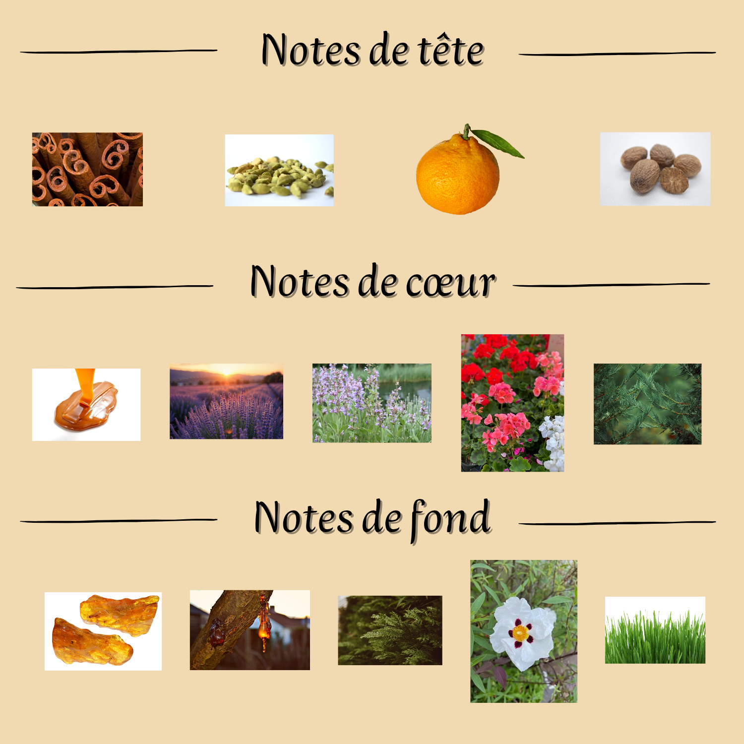 Notes de cœur : Caramel, Lavande, Sauge sclarée, Géranium, Cyprès