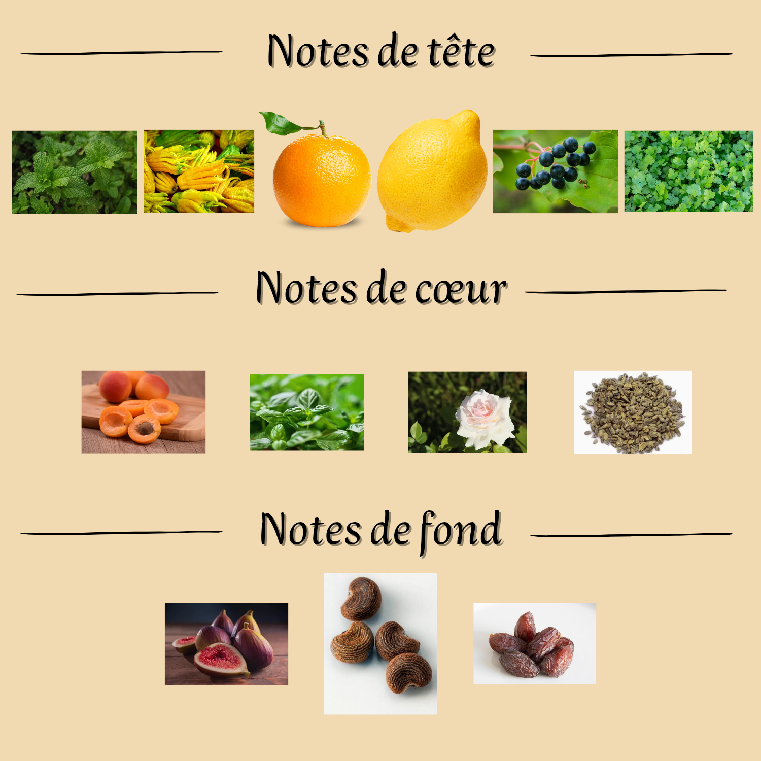 Notes de tête : Menthe, Cédrat, Orange, Citron, Cassis, Coriandre