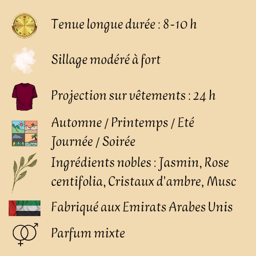 Pour une expérience sensorielle optimale, appliquez le parfum sur les points de pulsation tels que le cou, les poignets, la poitrine et derrière les oreilles, permettant ainsi une diffusion subtile et élégante tout au long de la journée.