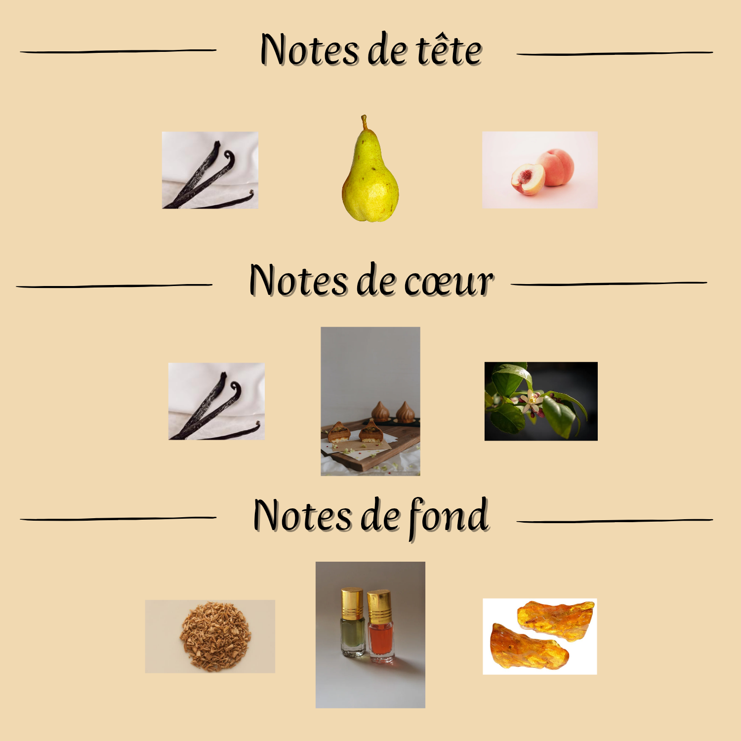 Notes de tête : Vanille, Fruits sucrés (Poire, Pêche)