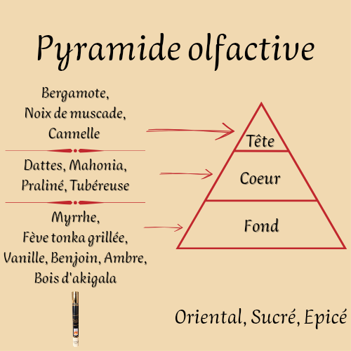 Notes de fond : Myrrhe, Fève tonka grillée, Vanille, Benjoin, Ambre, Bois d'akigala