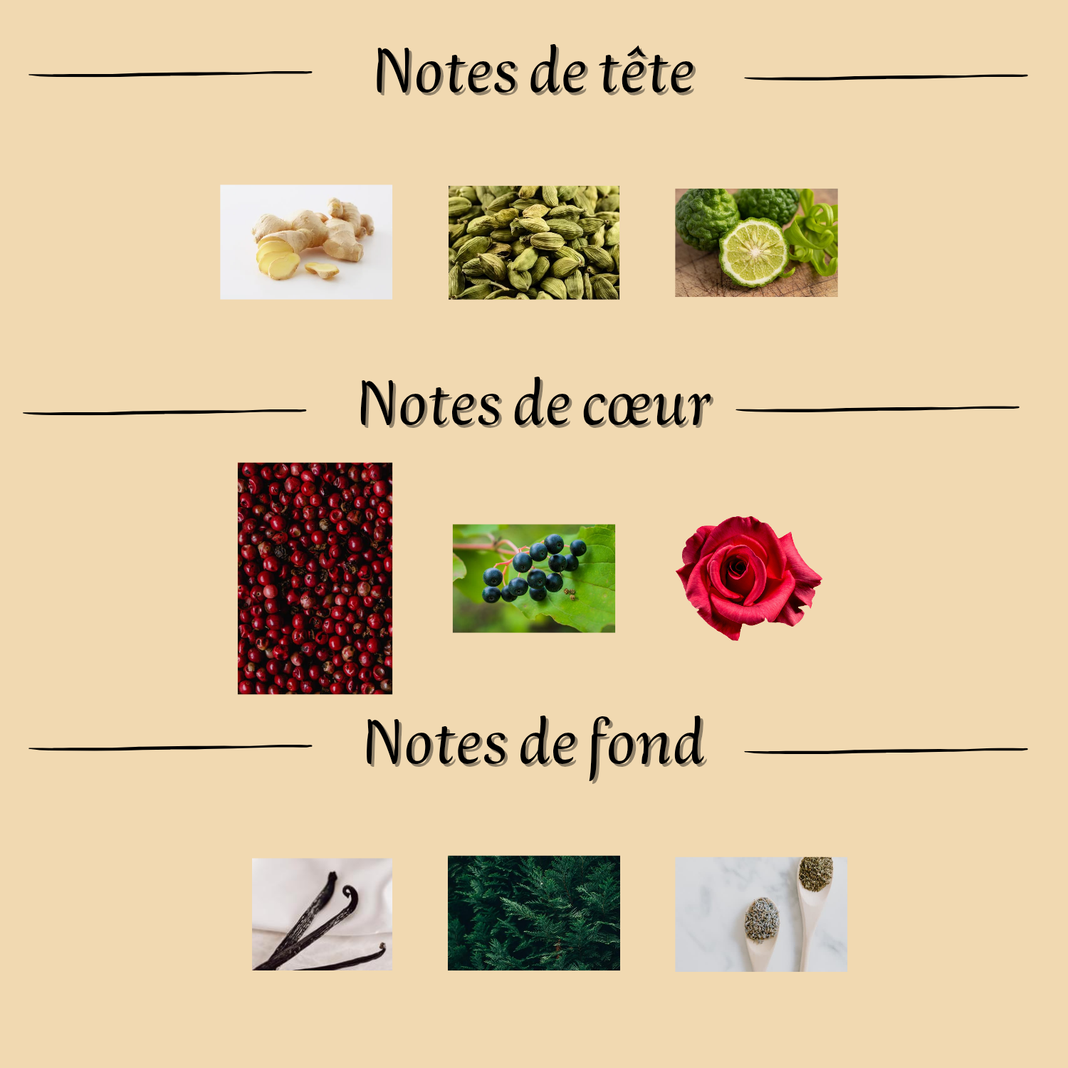 Notes de tête : Gingembre, Cardamome, Bergamote