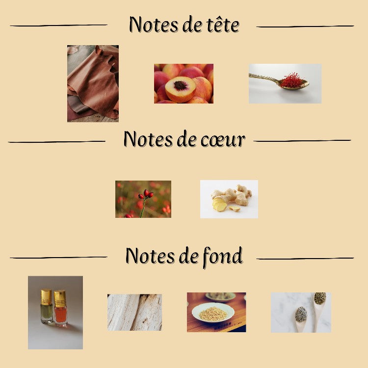 Notes de tête : Cuir, Pêche, Safran