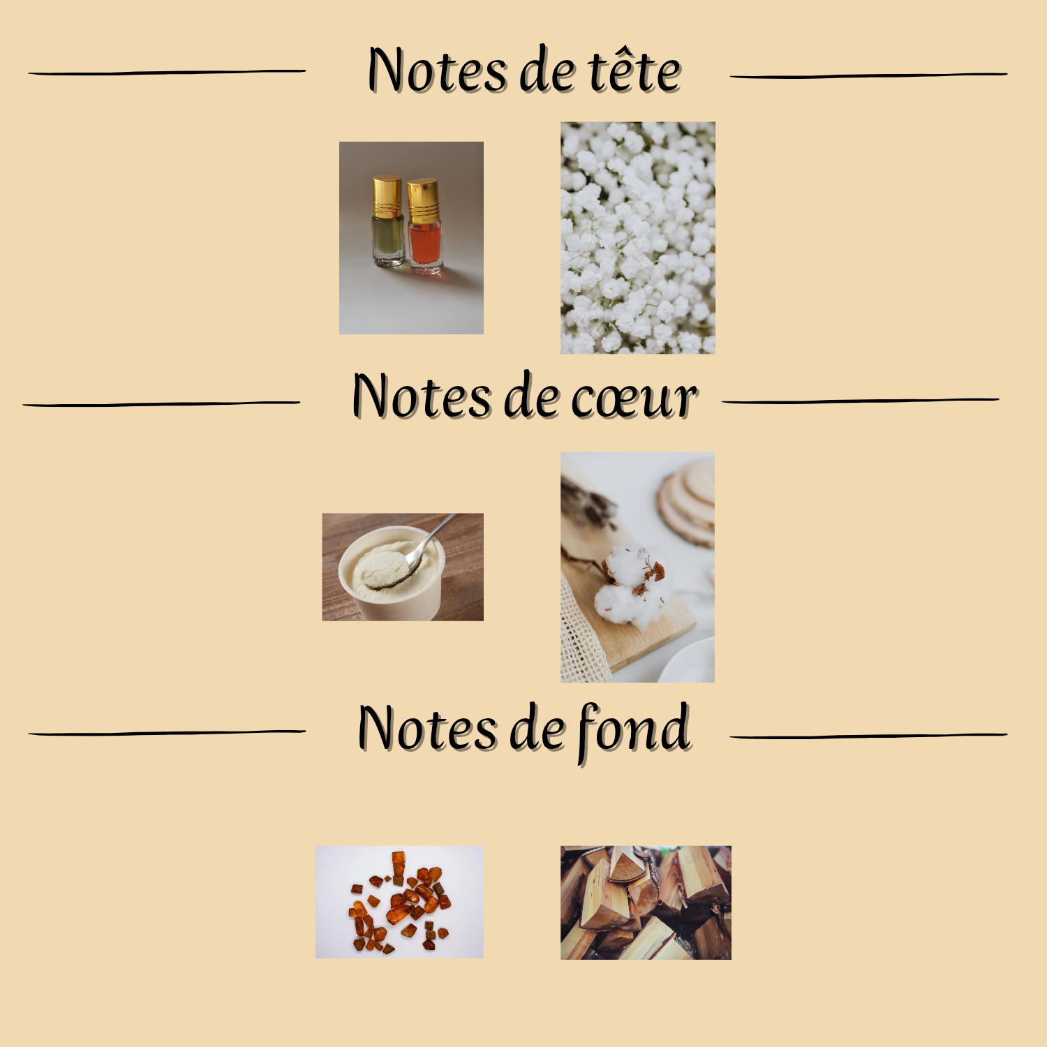 Notes de fond : Ambre doux, Bois clairs
