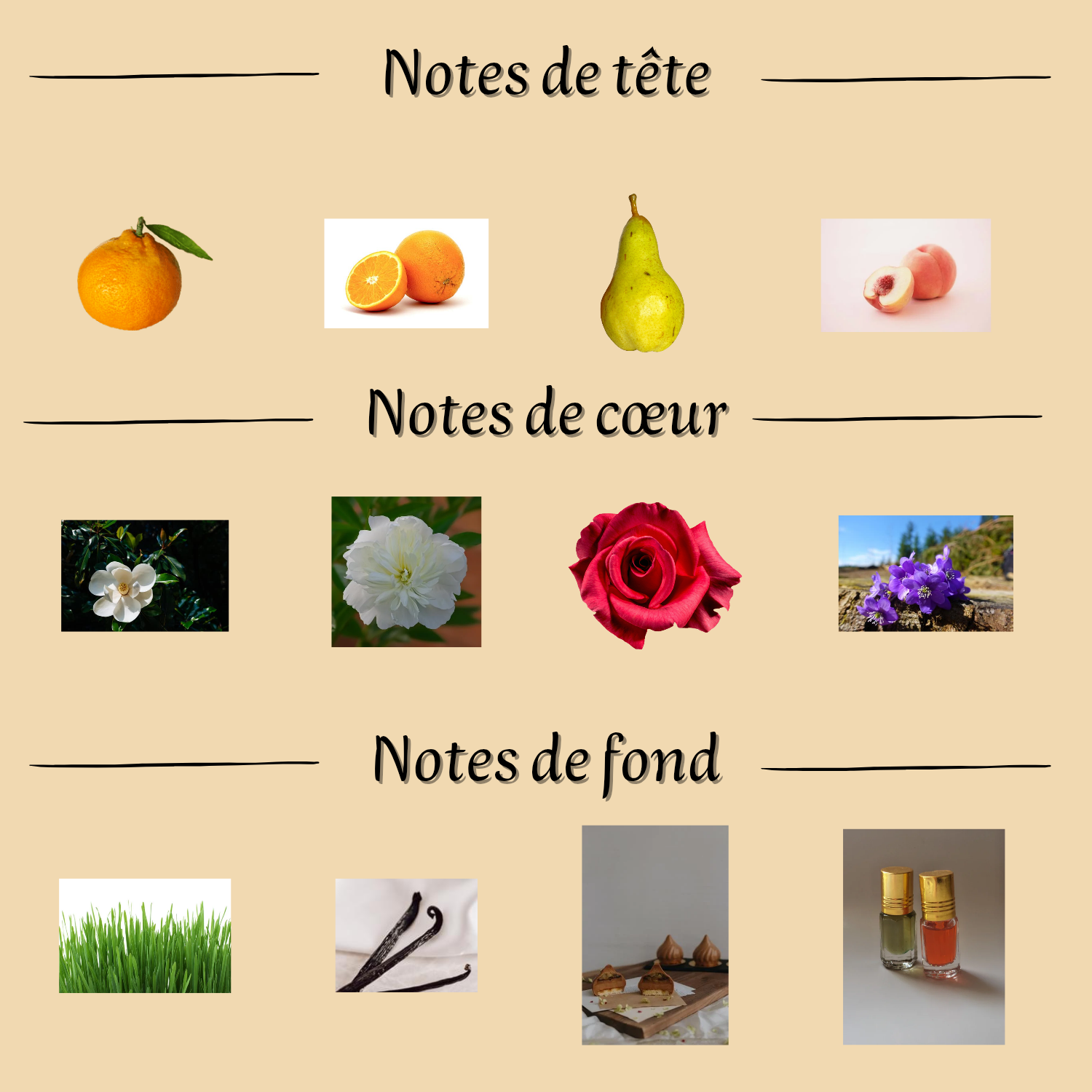 Notes de tête : Mandarine, Orange, Poire juteuse, Pêche sucrée